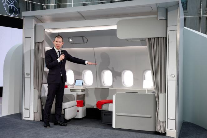 Benjamin Smith,le directeur général d’Air France-KLM,dévoile les sièges de la future première classe d’Air France,à Paris,le 18 mars 2025. BENOIT TESSIER/REUTERS Champagne,caviar et chefs étoilés ! Air France avait mis les petits plats dans les grands,dans un hôtel particulier de la place Vendôme,à l’occasion de la présentation,mardi 18 mars,de sa nouvelle première classe,baptisée,en toute simplicité, « La Première ». Benjamin Smith,a dévoilé en personne le nouveau siège des futurs passagers privilégiés de la compagnie aérienne.
