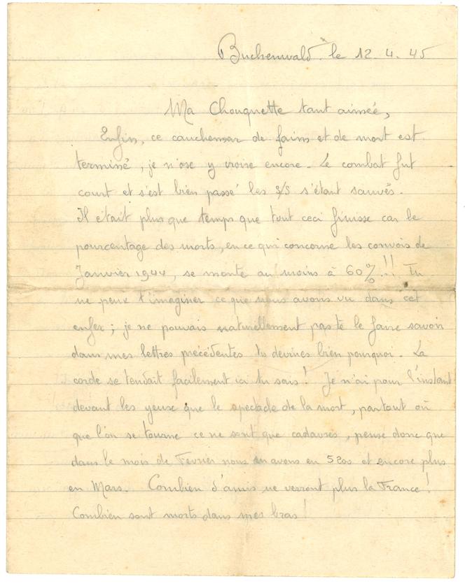 Enfin,ce cauchemar de faim et de mort est terminé. Je n’ose y croire encore. Le combat fut court et s’est bien passé,les SS s’étant sauvés. Il était plus que temps que tout ceci finisse car le pourcentage des morts,en ce qui concerne les convois de janvier 1944,se monte au moins à 60 % ! ! Tu ne peux t’imaginer ce que nous avons vu dans cet enfer ; je ne pouvais naturellement pas le faire savoir dans mes lettres précédentes,tu devines bien pourquoi. La corde se tendait facilement ici tu sais ! Je n’ai pour l’instant devant les yeux que le spectacle de la mort,partout où que l’on se tourne ce ne sont que cadavres,pense donc que dans le mois de février nous en avons eu 5 200 et encore plus en mars. Combien d’amis ne verront plus la France ! Combien sont morts dans mes bras !