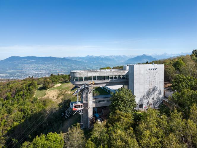 Le téléphérique du Salève (Haute-Savoie),en septembre 2023. MANUEL BOUGOT/DDA Greffé à la paroi rocheuse,à 1 100 mètres de hauteur,un fantastique édifice en béton est érigé dans le ciel. C’est l’arrivée du téléphérique du Salève (Haute-Savoie) : un assemblage de colonnes et de passerelles,coiffé d’un long volume aux allures de zeppelin flottant dans l’azur – ou de vaisseau fantôme inquiétant,selon l’état de la météo. Dernier bastion de la chaîne du Jura,ce mont Salève,dont la silhouette placide se découpe dans le ciel de Genève (Suisse),offre une vue imprenable sur les Alpes voisines.