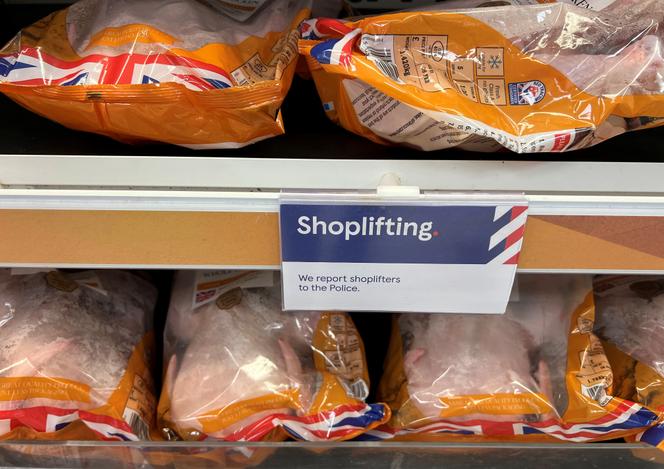 Un message affiché sur un rayon de viande (« nous signalons les voleurs à l’étalage à la police »),dans un supermarché de Manchester (Royaume-Uni),le 30 janvier 2025. PHIL NOBLE/REUTERS Les deux hommes en pull à capuche noir s’acharnent à coups de pied contre un présentoir garni de smartphones. Ils finissent par l’arracher et l’emportent,franchissant nonchalamment la porte à tambour d’un magasin. Ils ne portent pas de masque pour dissimuler leur visage. L’opération a pris moins de cinq minutes.