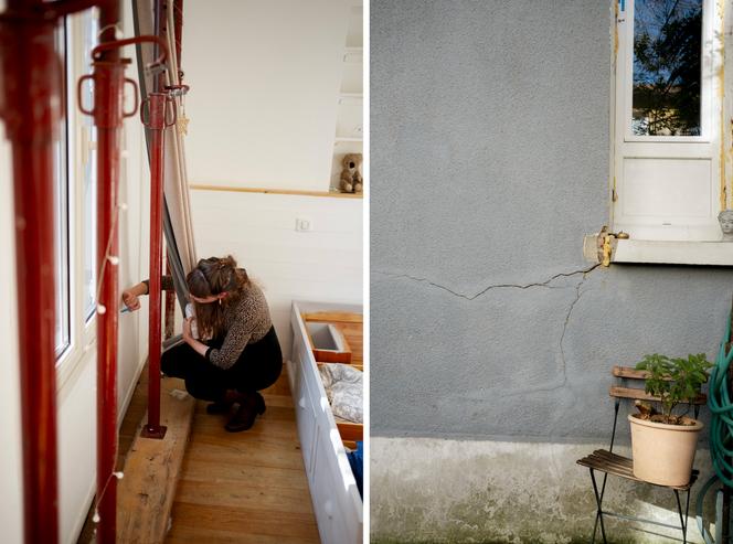 Marie Le Mélédo est parmi les plaignants qui attaquent l’Etat pour manquement face au dérèglement climatique. Son studio des Lilas (Seine-Saint-Denis) est inhabitable à la suite de mouvement de terrain. Les Lilas,le 31 mars.  AGNES DHERBEYS/MYOP POUR «LE MONDE» C’était l’endroit où elle s’imaginait vieillir avec ses chats : un coquet studio donnant sur un carré de verdure,dans une calme cour d’immeuble des Lilas (Seine-Saint-Denis). Elle l’avait fait entièrement rénover,le décorant de meubles aux tons clairs pour l’inonder de lumière. Mais de retour de vacances,à l’été 2020,Marie Le Mélédo découvre son appartement sinistré. Les portes et les fenêtres ne s’ouvrent plus,le sol s’est enfoncé,et de multiples fissures balafrent les murs. Le bâtiment est rapidement classé en arrêté de péril. Après la « panique » débute un « enfer »,raconte l’experte en agroécologie,âgée de 37 ans,désignant le pied-de-biche qui lui servait à entrer et sortir de chez elle et les étais soutenant le plafond.