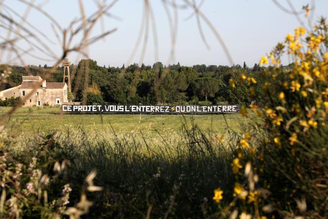 Au mas des Mourgues du Grès à Beaucaire (Gard),protestation contre la ligne à très haute tension prévue entre Jonquières-Saint-Vincent (Gard) et Fos-sur-Mer (Bouches-du-Rhône),le 5 juin 2024. FARINE VALÉRIE/MAXPPP « Enterrez la ligne,zéro pylône dans le Gard comme ailleurs ! » Sur les ronds-points,dans les champs,sur les panneaux d’affichage municipal… Dans le Gard comme dans l’ouest des Bouches-du-Rhône,la lutte menée depuis un an contre l’installation d’une ligne à très haute tension (THT) de 400 000 volts,qui doit s’étendre sur une soixantaine de kilomètres jusqu’à Fos-sur-Mer,persiste. Et elle a déjà obtenu une victoire : la mise en place d’un débat citoyen,version XXL.