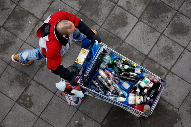 Un homme fait du porte-à-porte avec un chariot rempli de bouteilles en verre qu’il récupère pour la consigne,à Berlin,le 17 janvier 2019. DAVID GANNON / AFP L’historien Nicolas Marty,professeur d’histoire économique contemporaine à l’université de Perpignan Via Domitia,revient sur l’émergence et le déclin de la consigne dans les années 1950.